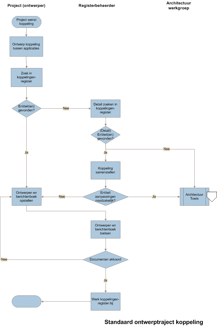 In deze afbeelding zie je hoe het project zelf in het register zoekt naar herbruikbare onderdelen en wanneer deze gevonden worden inzet in het vervolg van het project. Wordt niets gevonden dan wordt de registerbeheerder benaderd die een detail zoekopdracht doet. Vindt ook de beheerder niets dan wordt een werkgroep van experts gevormd die een